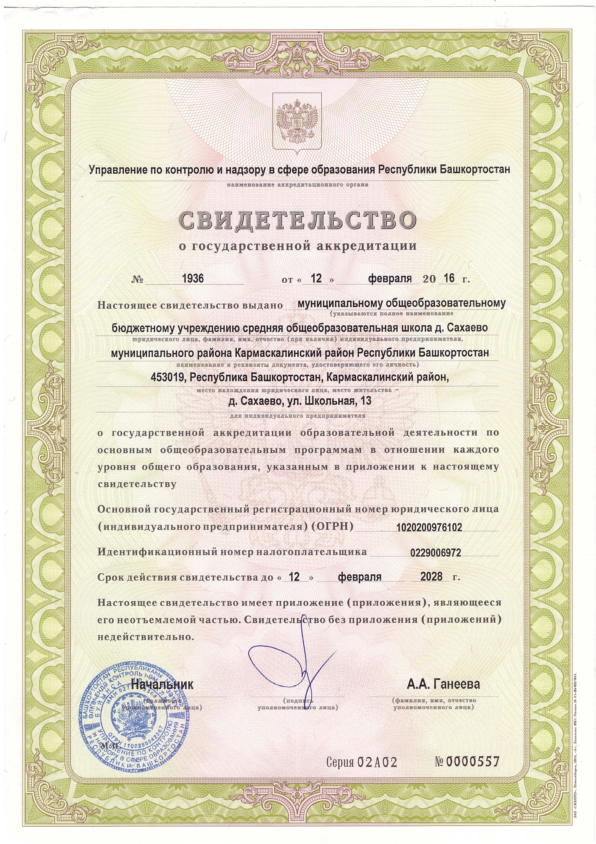 (фактический адрес): 453019, Республика Башкортостан, Кармаскалинский район, д. Сахаево, ул. Школьная, 13;
